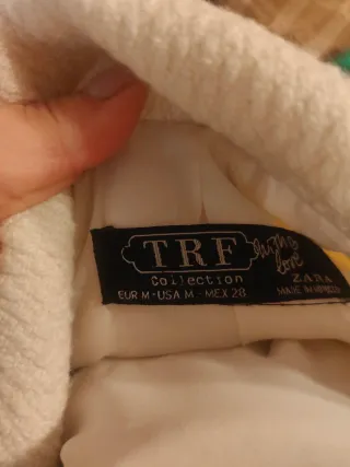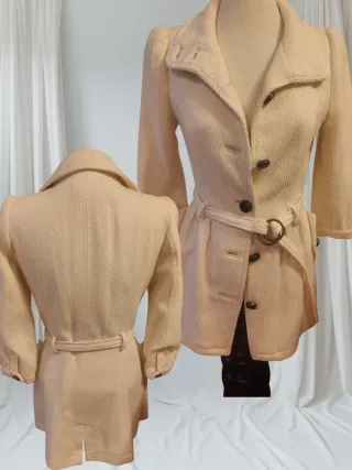 Elegante chaqueta de Zara en color beige, con un diseño entallado que realza la figura. Perfecta para añadir un toque sofisticado a cualquier atuendo. - Cierre abotonado. - Cinturón a juego con hebilla metálica. - Cuello solapa. - Mangas tres cuartos. - Tendría que reforzarse uno de los botones, como se ve en la foto, pero está en perfecto estado.