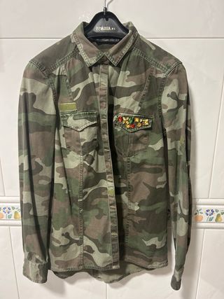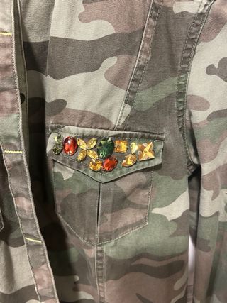 Sobrecamisa de estilo militar con estampado de camuflaje. Presenta detalles de pedrería en uno de los bolsillos del pecho. - Cierre de botones. - Dos bolsillos en el pecho. - Parche decorativo en el pecho.