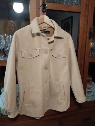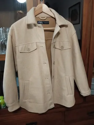 Sobrecamisa de Zara en color beige, talla XS, pero es amplia. Yo uso la S y me queda bien. La vendo porque no es mi estilo. - Cierre de botones. - Dos bolsillos en el pecho con botón. - Dos bolsillos laterales. - Cuello camisero.