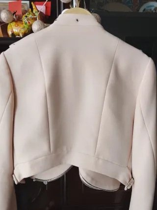 Chaqueta de estilo motero con un diseño asimétrico y detalles metálicos. - Cierre cruzado con cremallera. - Solapas pronunciadas. - Bolsillos laterales con cremallera. - Botones a presión en los hombros y puños.