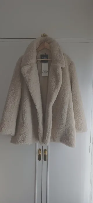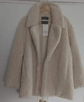 ¿Motivo de la venta? Regalo de Navidad y se me pasó el mes de devolución (tienes fecha de la compra en imágenes) Nuevo a estrenar. Conserva etiqueta de Zara. Abrigo corto con efecto pelo suave y agradable al tacto. Talla: S (tienes foto de las medidas) Materiales: 100% poliester tanto en el interior como en el exterior.