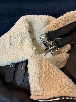 Abrigo estilo aviador con forro de borrego en color marrón y detalles en beige. NUEVO SIN USAR - Cierre frontal con cremallera. - Bolsillos con cremallera. - Cinturón ajustable en la cintura. - Cuello con hebillas y cintas.