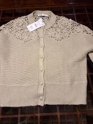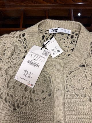 Chaqueta combinada punto crochet de la marca de moda Zara a estrenar. Manga larga. Cierre mediante botones en parte delantera. Color beige. Talla S. Ideal. Un básico.
