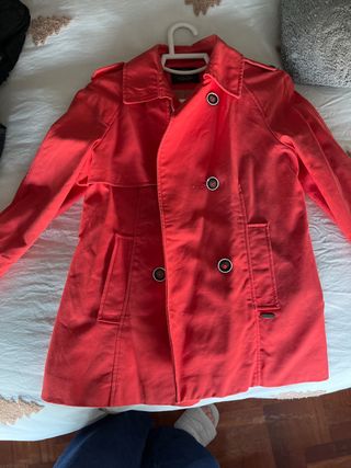 Muy pocos usos y en muy buenas condiciones. 65 cm pecho y 80 cm largo. Abrigo de corte clásico en color rojo. - Diseño de doble botonadura. - Bolsillos frontales. - Cuello solapa.
