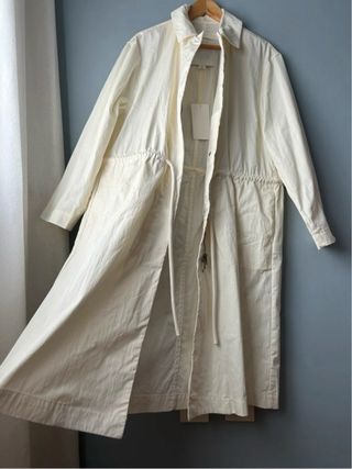 Gabardina de Zara en color marfil, talla L. Un clásico versátil para cualquier ocasión. Pone talla M pero valdría para L y XL - Cierre de automáticos y cremallera - Cintura ajustable con cordón. - Bolsillos laterales