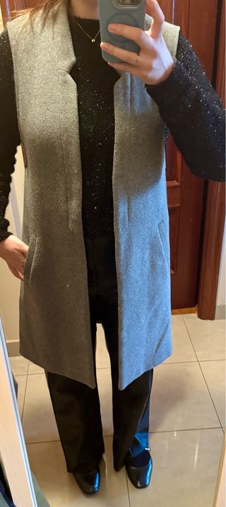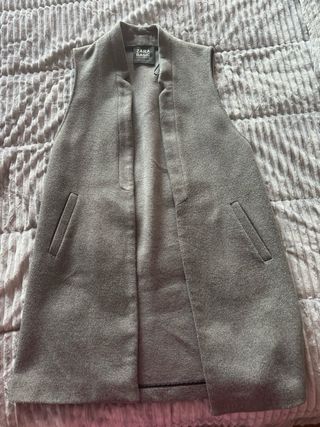 Chaleco largo de Zara en color gris. Contiene lana, es gordito y abriga - Dos bolsillos delanteros. - Cuello con solapa. - Corte recto.