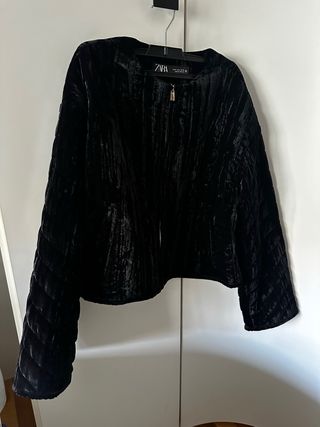 Chaqueta de terciopelo con un diseño moderno y elegante. - Cierre de cremallera frontal. - Cuello redondo. - Mangas largas con detalle acolchado. - Tejido suave y con textura.