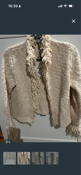 Chaqueta de Zara en color beige con un diseño original. - Detalle de flecos en el cuello y puños. - Tejido texturizado.