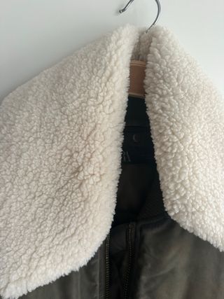 Chaqueta bomber de Zara con un diseño moderno y llamativo. - Mangas de pelo en contraste. - Cuerpo principal en color crema. - Puños y bajo en azul marino.