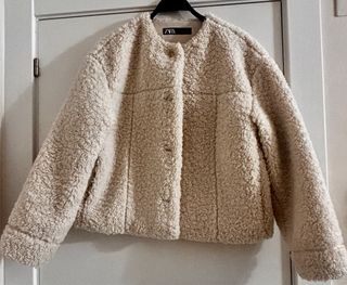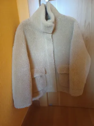 Chaqueta tipo borreguito de Zara. Color crema, fácil de combinar. Interior completamente forrado, muy cómoda y agradable al tacto. Corte recto, cuello redondo y cierre con botones delanteros. Bolsillos ocultos laterales . Talla S amplia . Yo suelo llevar una M.