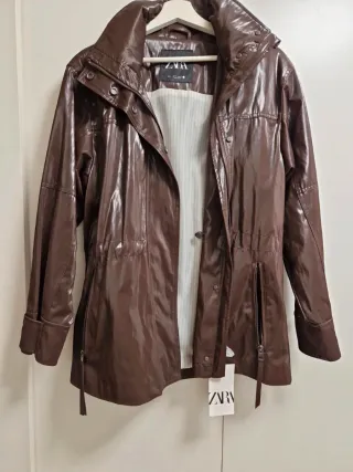 Cazadora acolchada de Zara con un acabado brillante que imita la piel. - Diseño moderno y versátil. - Capucha integrada. - Cierre de cremallera frontal. - Bolsillos laterales.