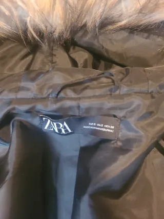Abrigo de Zara con un cálido forro interior. - Color marrón verdoso - Forro de pelo sintético. - Bolsillo interior de click - Bosillos delanteros - Cordón de ajuste en la cintura - Capucha - El pelo exterior de la capucha se puede quitar, tiene cremallera - Talla 40 - Marca Zara