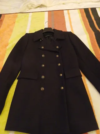 Elegante abrigo de Zara en color azul marino. Presenta un diseño clásico con doble botonadura y detalles dorados.