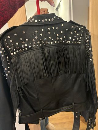 Chaqueta negra, de Zara, tiene dos bolsillos, y dos trabillas ajustables, un poco de cremallera en las mangas, se ata con una cremallera un poco lateral. Talla L