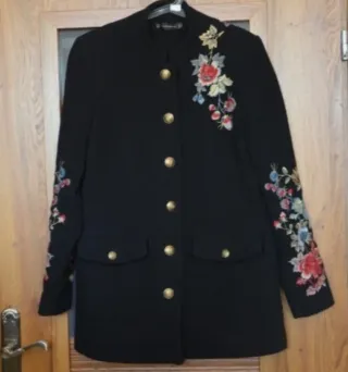 Elegante abrigo negro con un precioso bordado floral en mangas y solapa. - Diseño con botones dorados. - Bordado multicolor detallado. - Corte moderno. _En muy buen estado, pocas puestas