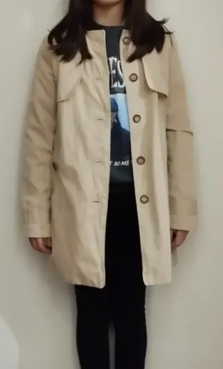Abrigo o chubasquero para niña, ideal para protegerse del frío y la lluvia. Con forro interior suave. - Talla 3-4 años. - Cierre de botones a presión o con cremallera - Dos bolsillos delanteros con botón. - Tiene unas manchas de pintura que yo no he conseguido quitar (se adjunta foto)