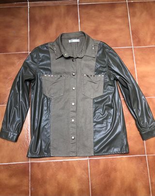 Cazadora de zara. Tiene dos tejidos: vaquero y polipiel. Tiene bolsillos delanteros con tachuelas. Color verde caqui. Talla L. En perfectas condiciones. Muy poco uso.