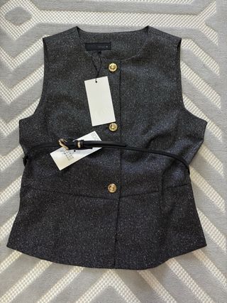 Elegante chaleco de la marca Zara. Presenta un diseño moderno y versátil. - Cierre de botones dorados. - Incluye cinturón fino negro. - Tejido con textura y detalles brillantes.