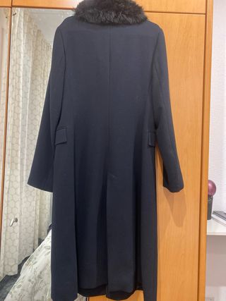 Abrigo color negro, diseño con cuello redondo, cierre frontal con automáticos y bolsillos en los laterales. Corte evase y tejido con un ligero bucle. Composición 100% lana. Está impecable, se ha usado en contadas ocasiones.