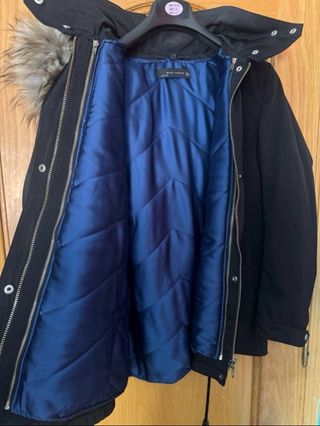 Abrigo de la marca Zara en color negro. - Capucha con pelo. - Cierre de cremallera. - Bolsillos con solapa y botón.