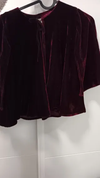 Elegante capa de terciopelo en un bonito tono granate. Es una prenda versátil y con un tacto muy suave. - Diseño con lazada en el cuello. - Corte amplio y fluido.