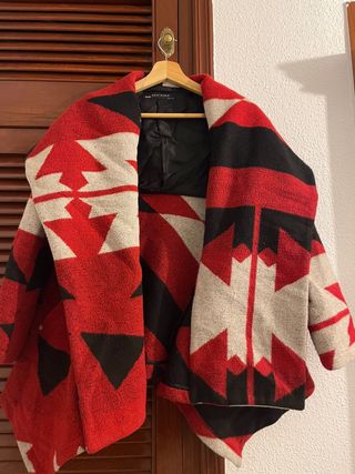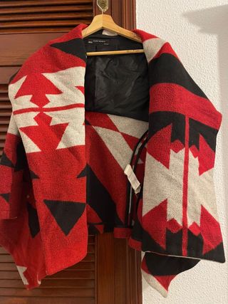 Abrigo de Zara con un llamativo estampado geométrico. - Diseño abierto. - Tejido con textura. - Patrón llamativo en rojo, negro y beige.