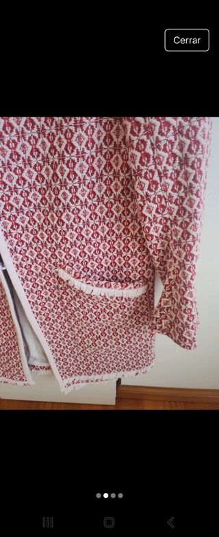 Chaqueta corta y en tejido ligero (algodón fino) con estampado rayas y pechera y puños bordados de Zara. Talla XS. Cierre sólo mediante cordón multicolor acabado con diferentes adornos: cascabeles, pompones...., en cuello. La manga no llega a ser larga sino 3/4. Nueva sin uso alguno. El precio es fijo; NO rebajo ni respondo a ofertas y menos absurdas. NO doy medidas ni acepto cambios ni devoluciones. Envíos a través de Wallapop.