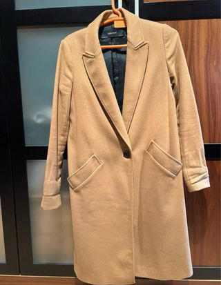 Abrigo camel beige con botones dorados y abertura en el bajo