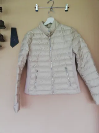 Abrigo plumas de Zara en color beige. Es una prenda cálida y cómoda. - Diseño acolchado. - Capucha. - Cierre de cremallera.