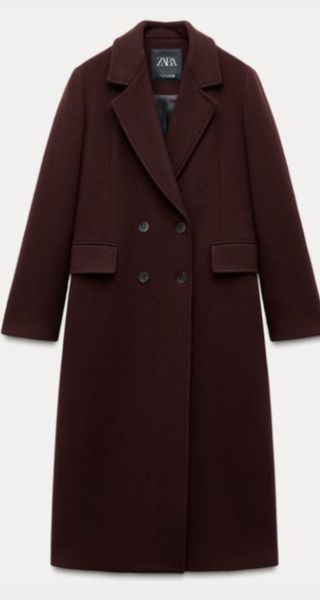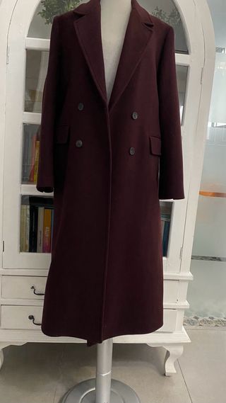 Abrigo largo de Zara en color burdeos. Un clásico de alta gama que nunca pasa de moda. - Diseño de doble botonadura. - Bolsillos frontales. - Cuello solapa.