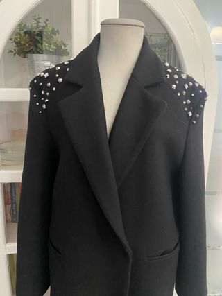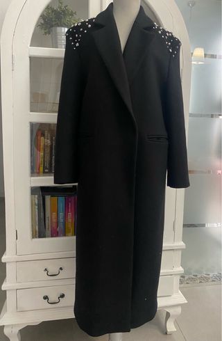 Elegante abrigo largo de Zara, confeccionado en lana de alta gama. - Diseño clásico con solapas. - Detalle de pedrería en los hombros. - Corte recto y largo. - Cierre frontal.