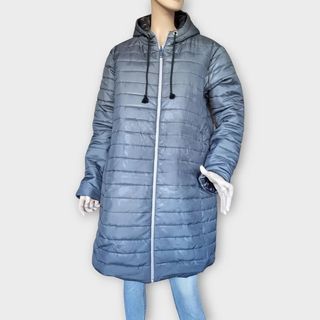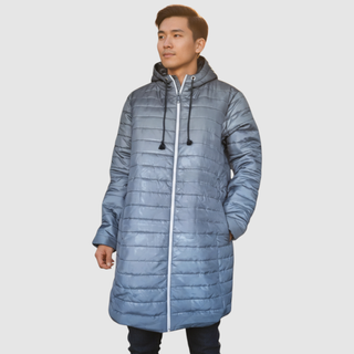Abrigo acolchado color gris con capucha, ideal para mantenerte abrigado. Dos bolsillos laterales exteriores y dos internos. Largo desde el cuello 96cm. Ancho hombros 50 cm. Largo manga 64 cm. Ancho sisa 61cm.