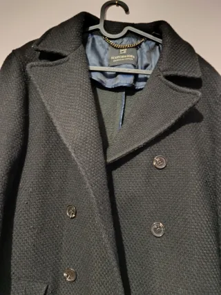 Elegante abrigo de lana de la marca Scotch & Soda. - está como nuevo - Color negro con detalles azules. - Talla L. Cuello: Tipo sastre Cierre: Botón Bolsillos: Bolsillos verticales, bolsillo interior Estampado: Unicolor Detalles: Tira de botones Material : lana y poliéster Nuevo está a +200€