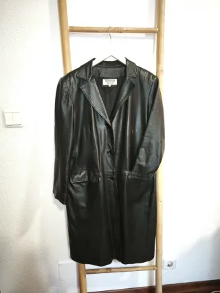 Elegante abrigo largo de cuero italiano. - Diseño clásico. - Cierre de cremallera. - Cinturón ajustable con hebilla.