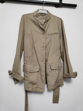 Chaqueta de mujer en color camel, ideal para un estilo casual. - Cuello mao. - Cierre de botones. - Dos bolsillos delanteros con solapa. - Cinturón a juego.