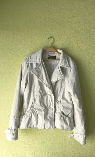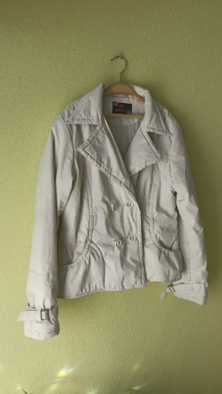 Elegante abrigo de corte clásico en color blanco crudo. Un clasico atemporal que nunca pasará de moda. No es nuevo pero en excelente estado. Yo cuido mucho todas las prendas - Diseño con botones plateados. - Bolsillos frontales. - Ribete decorativo en cuello, puños y bajo.