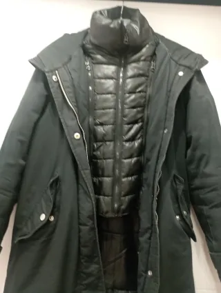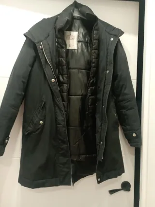 Abrigo negro largo de Springfield. Es talla xs pero da más talla S-M - Cierre de cremallera. - Bolsillos frontales. - Capucha integrada. Tiene los puños algo gastados del uso