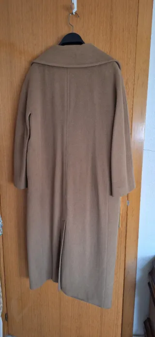Abrigo largo de lana en tono beige, con un diseño clásico y elegante. - Cierre cruzado con botones. - Cuello solapa amplio. - Forro interior satinado.