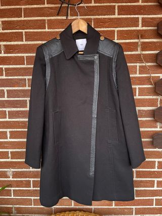 Elegante abrigo de Mango con un diseño moderno y detalles combinados. - Combinación de tejidos. - Cuello con solapas. - Cierre cruzado asimétrico. - Detalle de hombros y ribetes en polipiel.