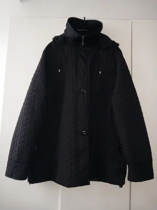 Abrigo acolchado con capucha y cierre de botones. Talla 52, sisa 66, largo 86, da bastante talla. - Diseño acolchado con rombos. - Cierre de botones dorados. - Capucha integrada. - Bolsillos laterales.