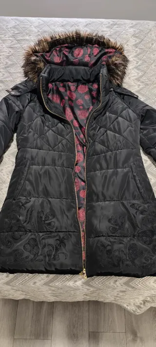 Abrigo acolchado de la marca Desigual con un diseño elegante. - Detalle de bordado floral en la parte inferior. - Forro interior con estampado de motivos circulares en rojo. - Capucha con pelo sintético.