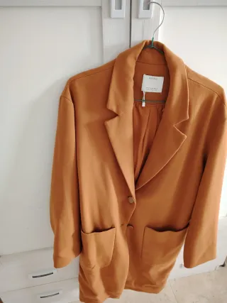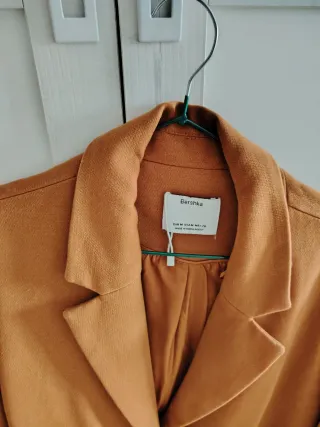 Elegante abrigo como nuevo de Uterqüe con un bonito color salmón o naranja pastel. - Confeccionado en lana y alpaca, algodón, acrílico, poliester, poliamida. - Diseño de corte clásico con solapas. - Bolsillos laterales. Largo 80cm. Axila 52cm.
