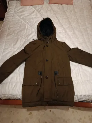 Abrigo de hombre con capucha y cierre de cremallera. -Es una XL pero muy justa más bien una L - Bolsillos frontales con botón. - Bolsillo superior con cremallera. - Cordones ajustables en la capucha.