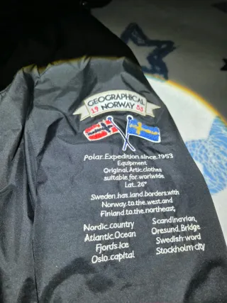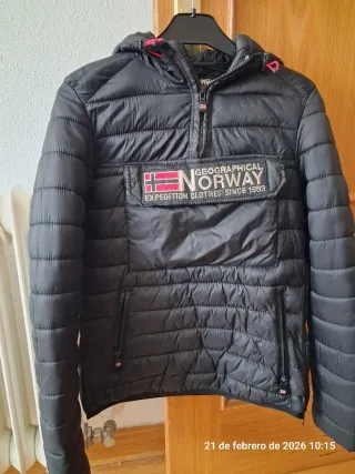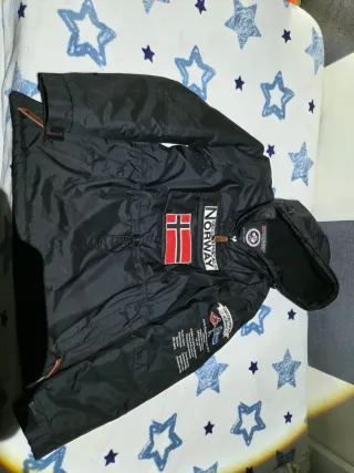 Abrigo de la marca Geographical Norway Expedition since 1953 en color negro. Diseño moderno y funcional. - Cierre de cremallera. - Capucha ajustable. - Bolsillos frontales con cremallera. - Detalles de la marca en el pecho y manga. La cuerda del ajuste de la cadera está salida Se escuchan ofertas