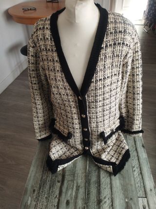 Elegante abrigo de tweed con un diseño clásico. - Tejido texturizado en tonos beige y negro. - Ribete y puños en contraste negro. - Cierre de botones frontales. - Bolsillos decorativos con detalle.