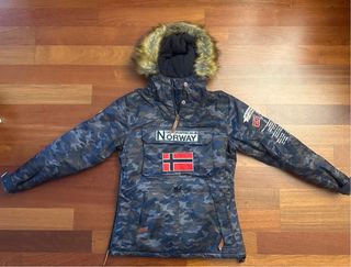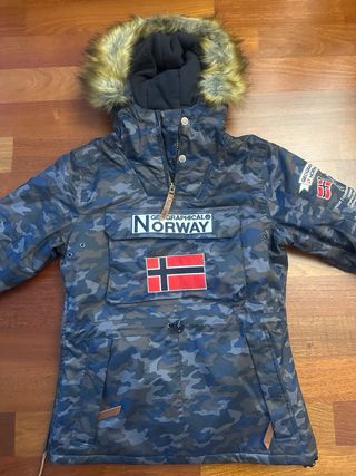 Abrigo con estampado de camuflaje y detalles distintivos. - Capucha con pelo. - Bolsillo frontal grande. - Bandera de Noruega en el pecho.