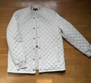 Abrigo acolchado de Tommy Hilfiger en color blanco. Presenta un diseño moderno y cómodo. - Cierre de botones a presión. - Cuello redondo. - Puños y bajo elásticos.