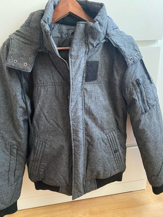 Abrigo corto de la marca Zara en color gris. Diseño acolchado y con capucha. - Cierre de cremallera. - Puños elásticos. - Bajo ajustable con cordón.