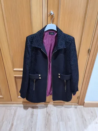 Elegante abrigo con un diseño geométrico en relieve y forro interior. En perfectas condiciones. Talla 44. - Cierre de cremallera. - Bolsillos frontales con detalle de botón y cremallera dorada. - Cuello solapa