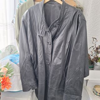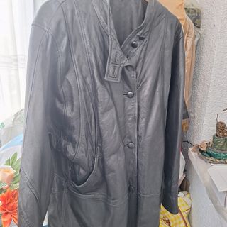 Elegante chaquetón de cuero tres cuartos para mujer. - Diseño clásico y atemporal. - Cierre de botones. - Cuello alto con detalle. - Bolsillos frontales.